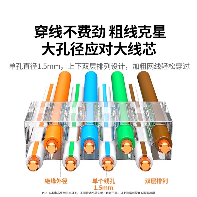 水晶头(学名 RJ45 连接器)是网线与网络设备(电脑、路由器等)对接的无源接头,外壳透明,内有 8 个镀金触点(对应网线 8 根芯线),带卡扣弹片防脱落。产品特性:/产品包括语音水晶头、超五类非屏蔽水晶头、六类非屏蔽水晶头/弹片“怡网通”,黄铜平角,2叉/插拔≥1000次,弯折≥50次/100个/盒/通过耐压、盐雾测试。